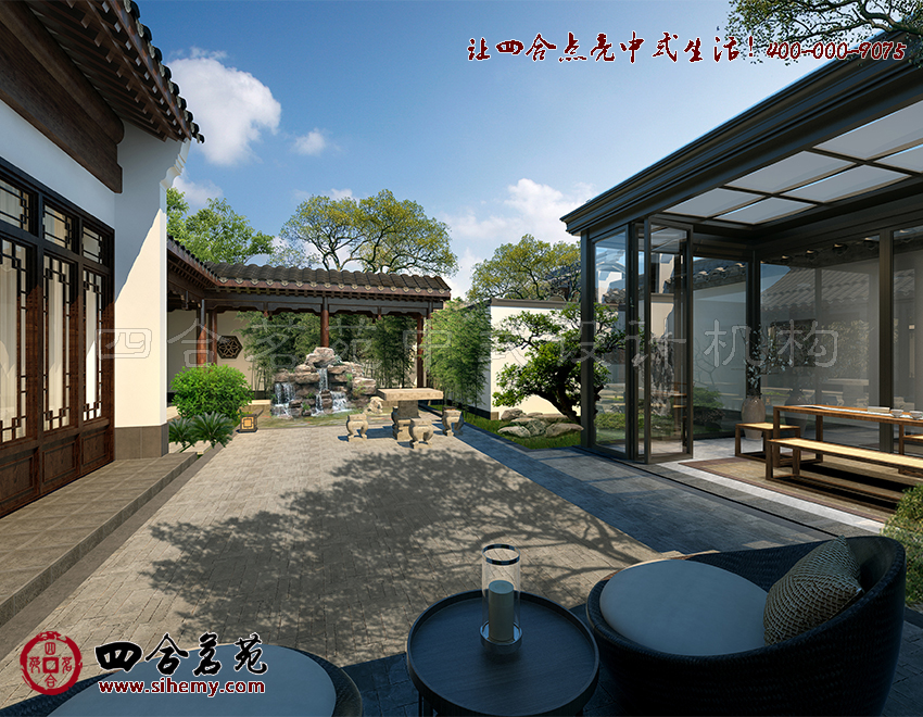 對于中式元素運用,可以勾勒出更多設計方案中的中式體驗。四合茗苑關注中式元素運用。粉墻黛瓦的院墻,漏窗花窗造型各異,色彩淡雅,在庭院中線條與色彩交相輝映中合院顯得溫馨而幽謐。